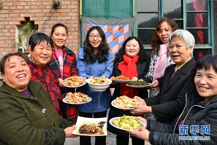 山西省平定县娘子关镇关沟村扶贫工作队队员籍艳艳(左四)在厨艺比拼活动后与村民合影(2月27日摄)。新华社记者 曹阳 摄