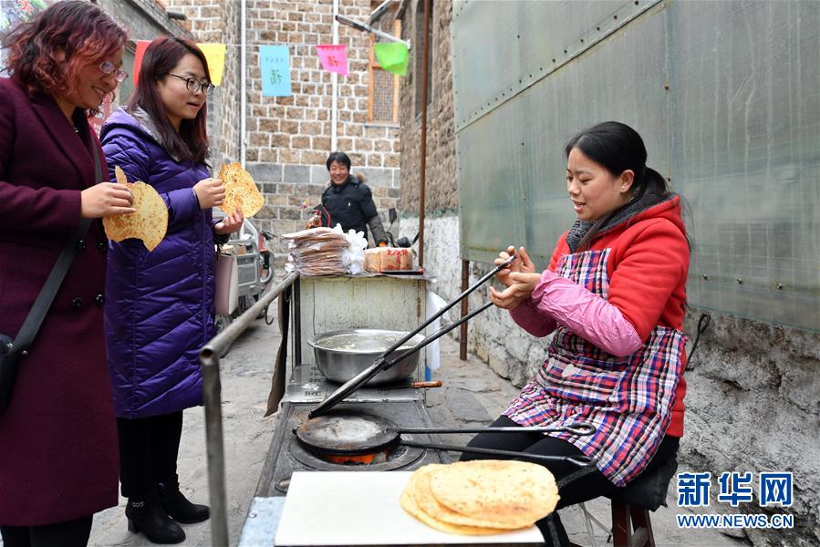 山西省平定县娘子关镇娘子关村村民王永珍(右一)在制作当地传统面食(2月26日摄)。新华社记者 曹阳 摄