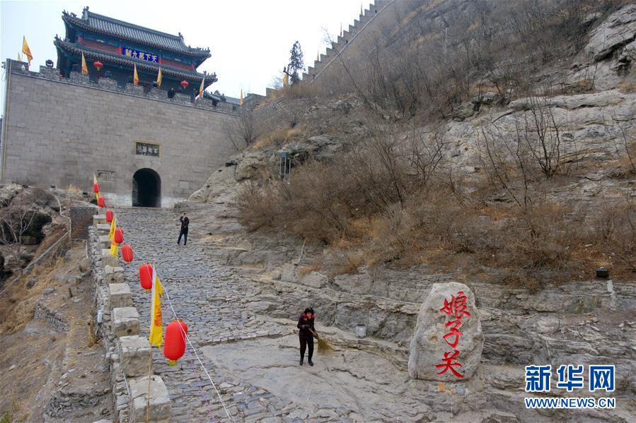 山西省平定县娘子关镇娘子关村村民段桂英(前)在清扫景区道路(2月26日无人机拍摄)。新华社记者 曹阳 摄