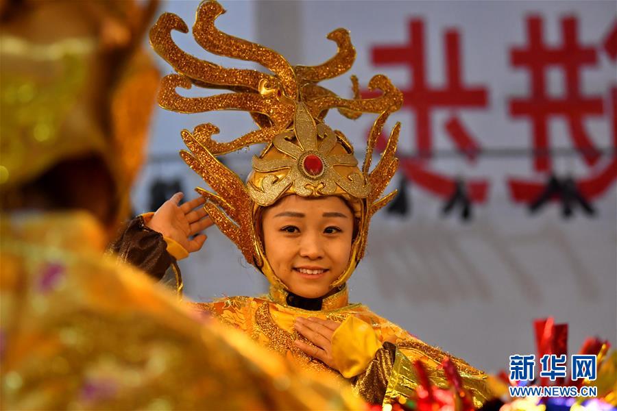 山西省平定县娘子关镇娘子关村的一名村民在排练准备为游客演出的舞剧《大唐娘子军》前整理头饰(3月6日摄)。新华社记者 曹阳 摄