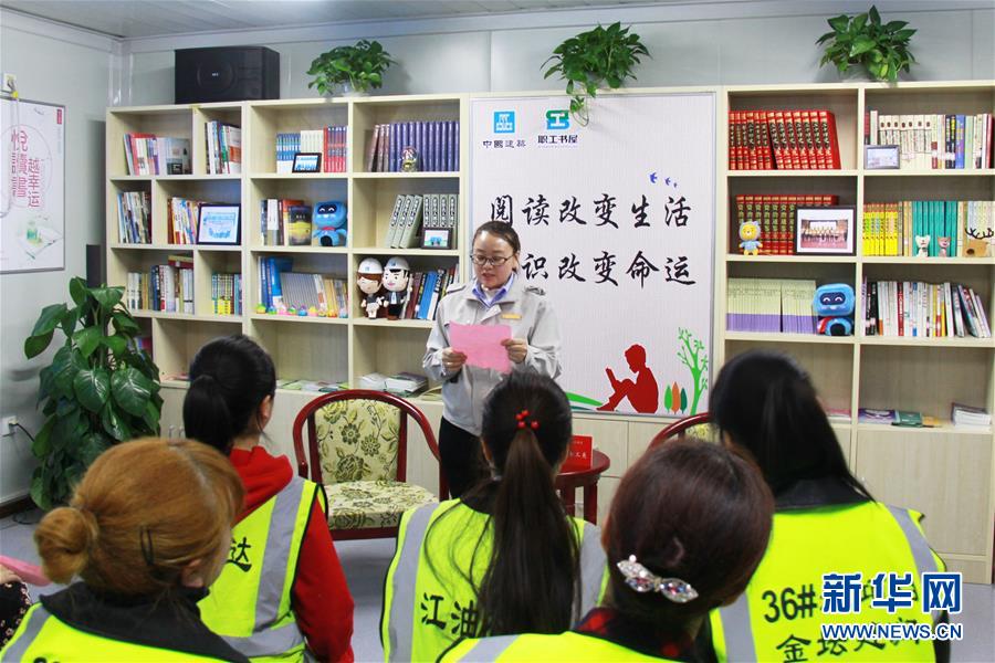 3月7日,中建二局三公司女工杨少华在朗读会上朗读。 当日,中建二局三公司在北京丰台科技园工地书屋举行“庆三八 工匠情 女工美”朗读会,女职工们参加朗读比赛,分享自己的阅读经历。 新华社记者 任鹏飞 摄