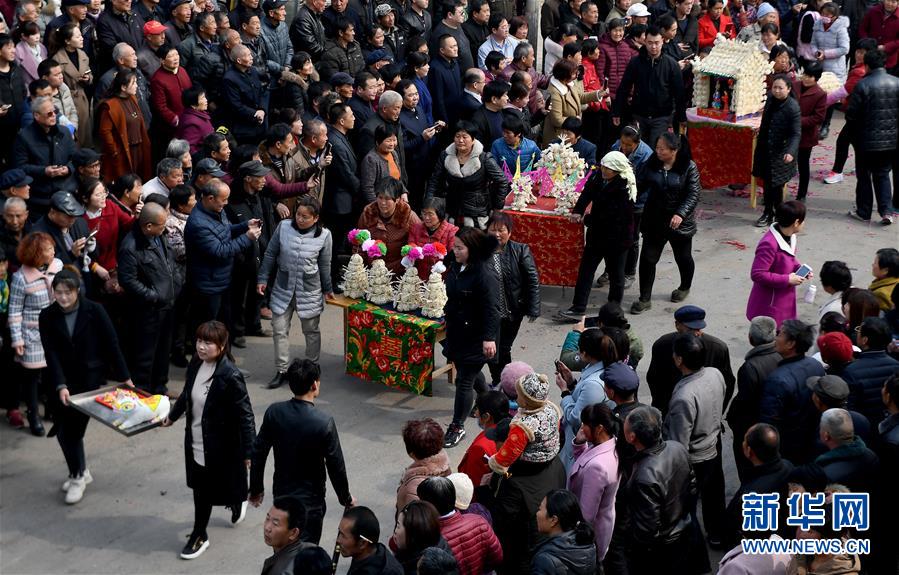 3月7日,在阿寿村赛花馍活动现场,村民在进行花苫鼓表演。 当日,陕西省大荔县羌白镇阿寿村举行一年一度的赛花馍活动。花馍俗称面花,陕西关中地区每到年节都会制作花馍。如今的花馍,不但承载着人们对美好生活的向往,还成为当地群众发展经济的一项产业。 新华社记者 刘潇 摄