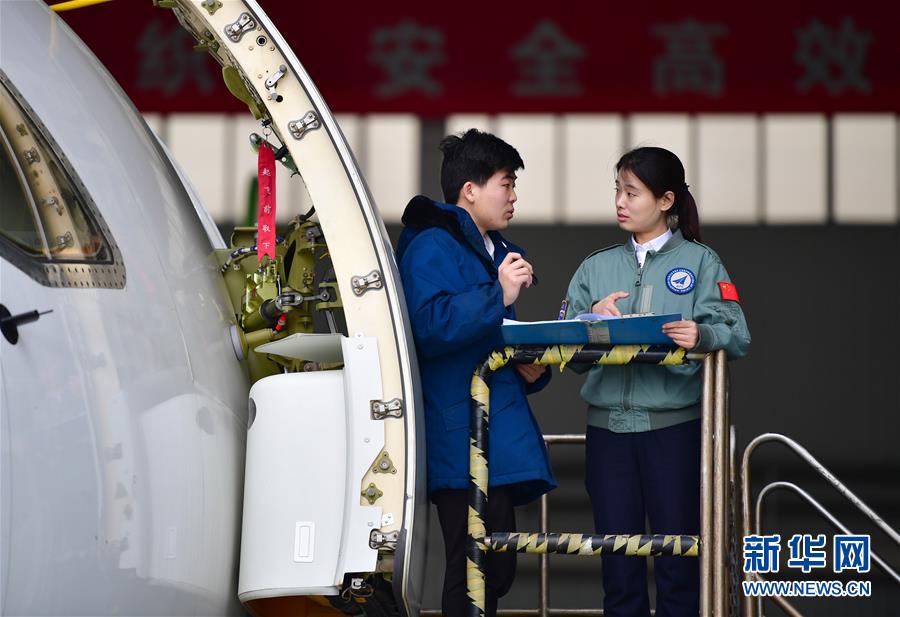 3月5日,蒋丹丹(右)在飞行试验机舱门前与机务人员交流飞机试飞情况。新华社记者 邵瑞 摄
