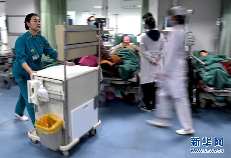 3月7日,在河南省人民医院急诊医学科急诊抢救病区,韩旭(左一)推着抢救车去协助救治病人。韩旭是河南省人民医院急诊医学科急诊抢救病区的一名护士,主要负责病人的院前急救和院内抢救。急诊医学科任务繁重,平均一天要接收四、五百名病人,忙碌、奔跑是韩旭工作中的常态,八小时的班次下来能走两万多步,入行11年的她也逐渐练成了奔跑在生命线上的“女汉子”。新华社记者 李安 摄