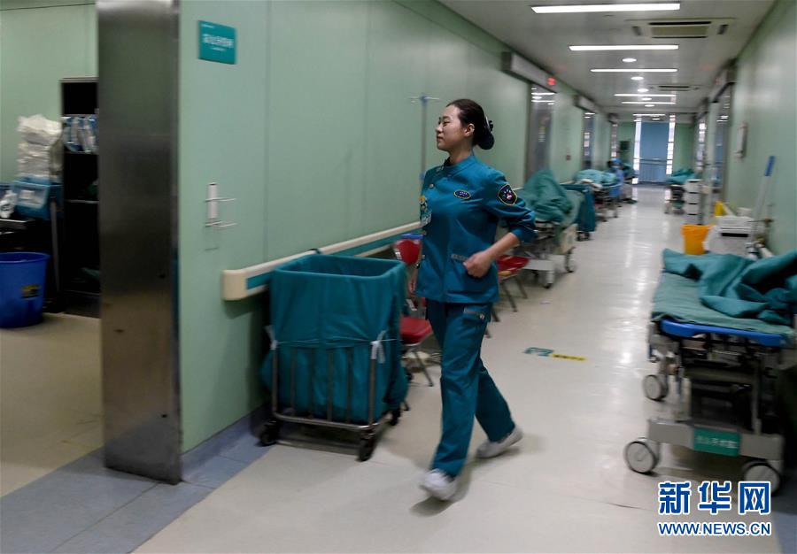 3月7日,韩旭到手术室接病人。韩旭是河南省人民医院急诊医学科急诊抢救病区的一名护士,主要负责病人的院前急救和院内抢救。急诊医学科任务繁重,平均一天要接收四、五百名病人,忙碌、奔跑是韩旭工作中的常态,八小时的班次下来能走两万多步,入行11年的她也逐渐练成了奔跑在生命线上的“女汉子”。新华社记者 李安 摄