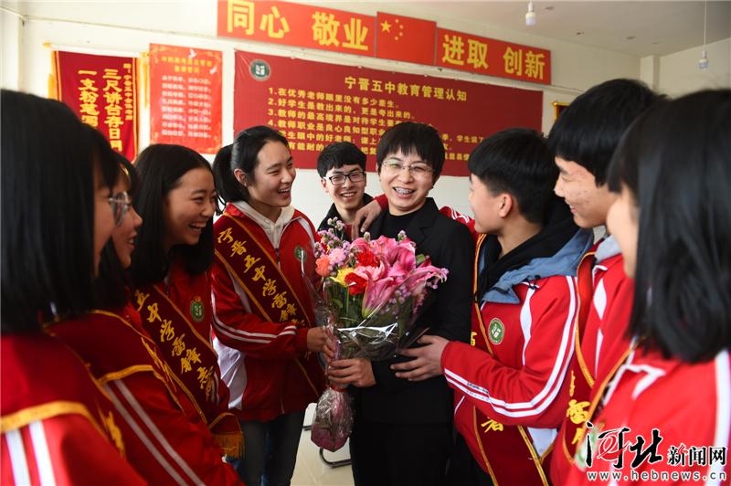 3月6日,“三八”妇女节即将到来之际,宁晋县第五中学学生为郭现蕊老师送上鲜花。