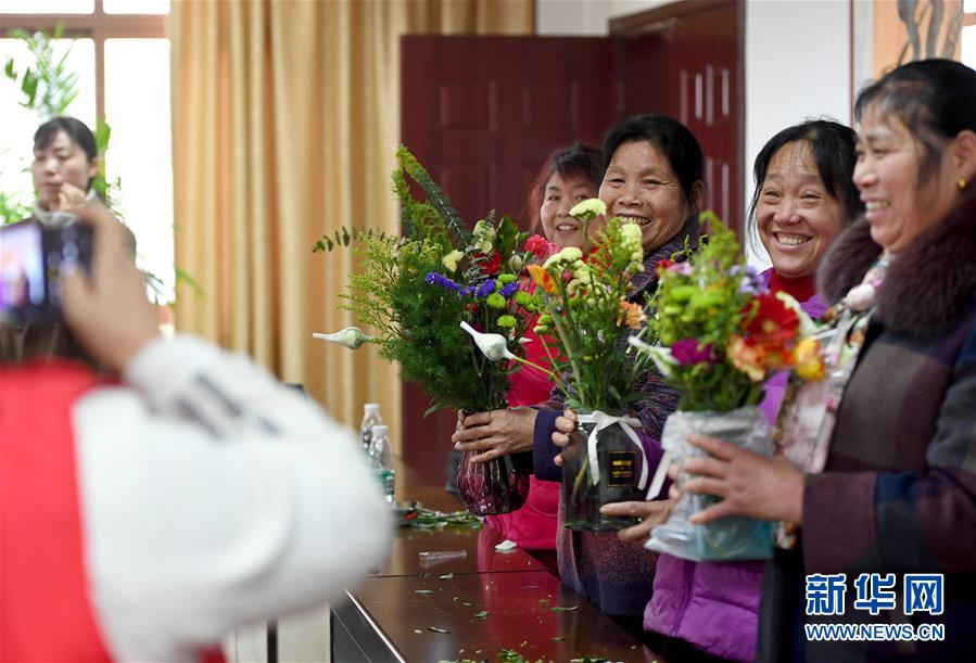 3月8日,志愿者给参加插花活动的社区居民合影。当日是“三八”国际妇女节,南昌市红谷滩新区九龙湖管理处与中建三局三公司一起举行“插花品香 礼仪同行”活动,向一线建筑女工及社区居民传授插花技艺和礼仪知识,欢度节日。新华社记者 万象 摄