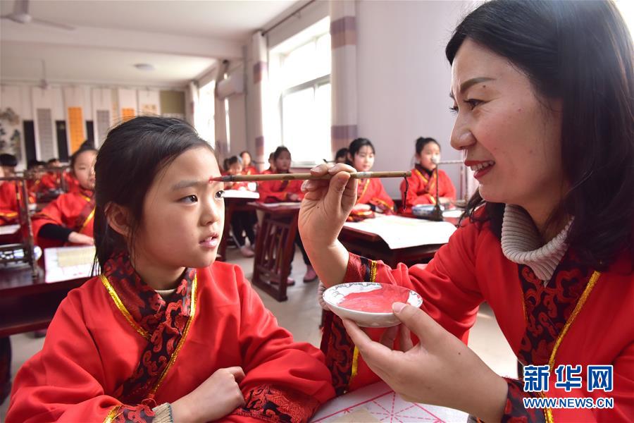 3月8日,在河北石家庄新乐市实验小学举行的开笔礼仪式上,老师为学生额头点朱砂。 当日是农历二月初二,各地举办丰富多彩的民俗活动。 新华社发(贾敏杰 摄)