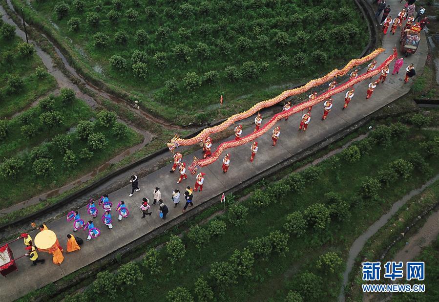 3月8日,在广西灌阳县举行的开耕节上,村民在表演舞龙(无人机拍摄)。 当日是农历二月初二,各地举办丰富多彩的民俗活动。 新华社发