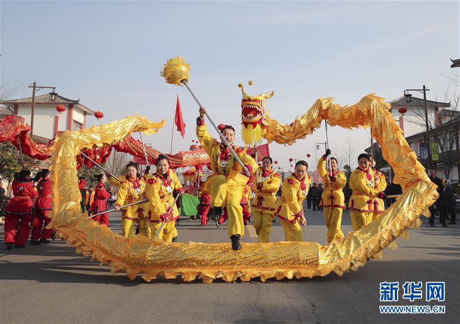 3月8日,在江苏连云港市赣榆区塔山镇,民间艺人在表演舞龙。 当日是农历二月初二,各地举办丰富多彩的民俗活动。 新华社发(司伟 摄)