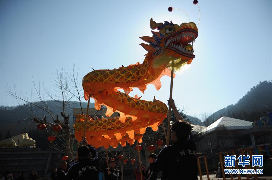 3月8日,来自河北沧州的民间艺人在山东烟台市塔山景区表演舞龙。 当日是农历二月初二,各地举办丰富多彩的民俗活动。 新华社发(申吉忠 摄)