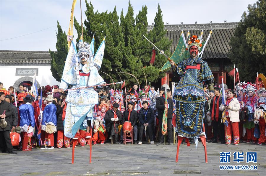 3月8日,在安徽芜湖县花桥镇九十殿庙会上,村民在进行高跷表演。 当日是农历二月初二,各地举办丰富多彩的民俗活动。 新华社发(张致荣 摄)