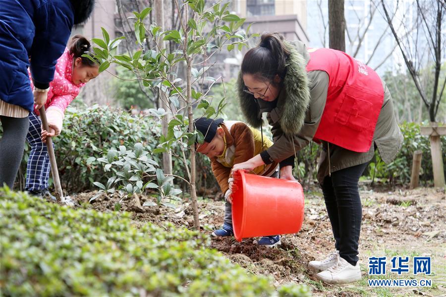 3月9日,在江苏省常州市新北区飞龙社区,家长带着孩子给树苗浇水。 在植树节即将到来之际,人们纷纷参加植树活动,为大自然添新绿。 新华社发(陈暐 摄)