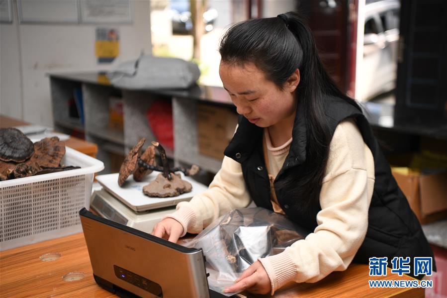 3月11日,在洛塔乡电子商务服务中心,吴添春将从乡亲们手中收购来的野生灵芝进行真空包装。