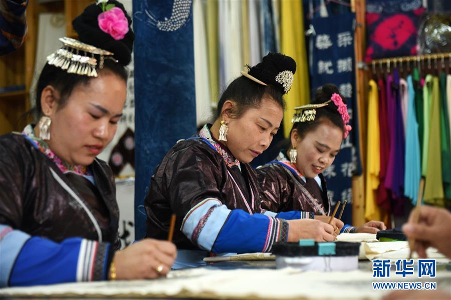 3月12日,在贵州省黎平县侗品源传统工艺农民专业合作社,侗族妇女在侗布上绘制蜡画。 近年来,贵州省黔东南苗族侗族自治州黎平县大力实施文化创意产业扶贫工程,对贫困妇女等群体进行技能培训,鼓励和扶持她们成立传统工艺农民专业合作社,把刺绣、侗布、蜡染等通过创意设计和加工,变成具有当地文化特色的旅游商品,帮助侗乡妇女就业和增收。 新华社记者 杨文斌 摄