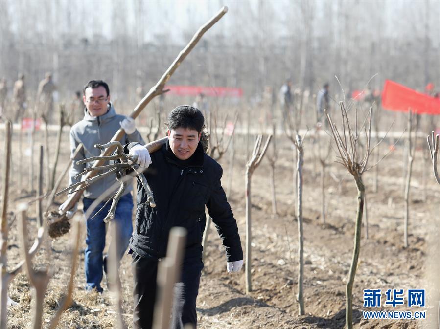 3月12日,人们在河北石家庄市栾城区张家庄村参加义务植树活动。 当日是植树节,各地举行多种形式的植树活动。 新华社发(梁子栋 摄)
