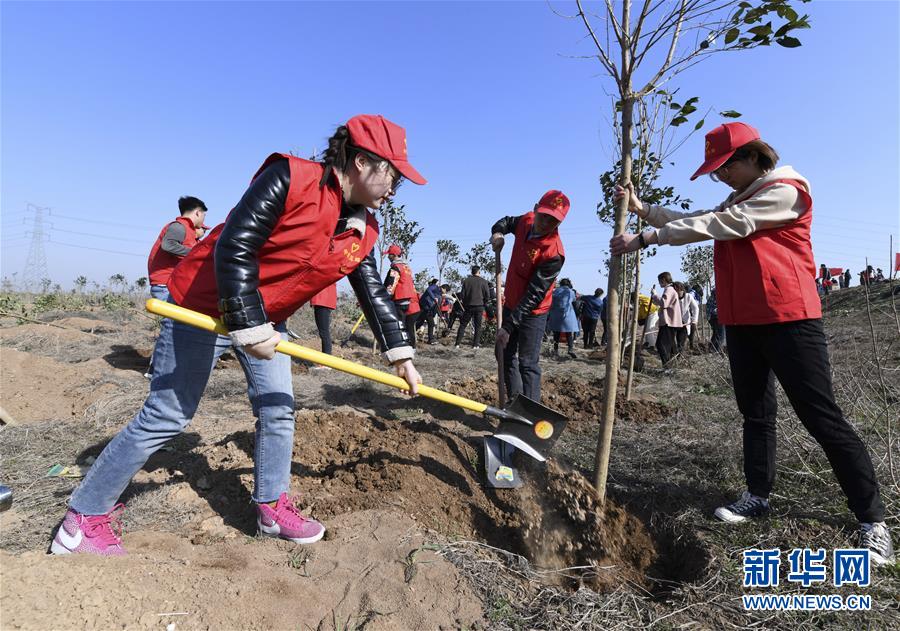 3月12日,安徽省阜阳市青年志愿者在“手植一棵树、绿化一片天”义务植树活动现场进行义务植树。 当日是植树节,各地举行多种形式的植树活动。 新华社发(王彪 摄)