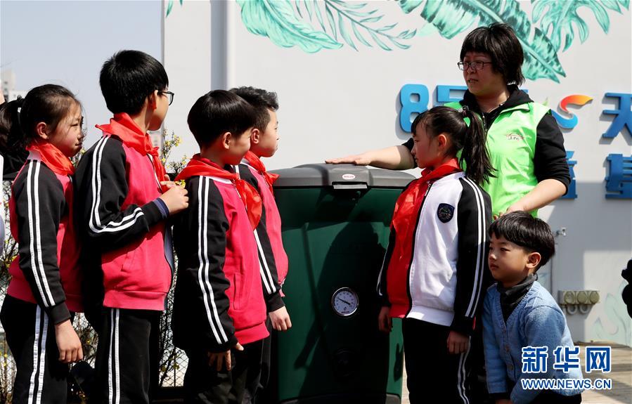 3月12日,社区志愿者向小朋友们讲解厨余垃圾堆肥桶的工作原理。 当日是植树节,来自上海师范专科学校附属小学的学生们在黄浦区五里桥街道8号桥特色创意园区内大楼屋顶的天空农场上,利用平时收集的厨余垃圾制成的堆肥种植绿色植物,享受垃圾分类成果的同时美化了环境。 新华社记者 方喆 摄