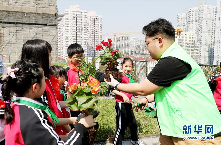 3月12日,社区志愿者将需要种植的绿色植物分发到小朋友手中。 当日是植树节,来自上海师范专科学校附属小学的学生们在黄浦区五里桥街道8号桥特色创意园区内大楼屋顶的天空农场上,利用平时收集的厨余垃圾制成的堆肥种植绿色植物,享受垃圾分类成果的同时美化了环境。 新华社记者 方喆 摄