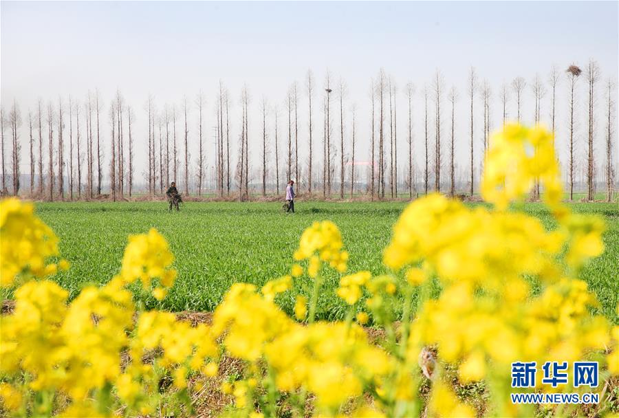 3月12日,农民在江苏南通海门市江心沙农场油菜花旁的麦田里除草、整理田埂。 春回大地,人们纷纷投入到忙碌的生产劳动中。 新华社发(许丛军 摄)