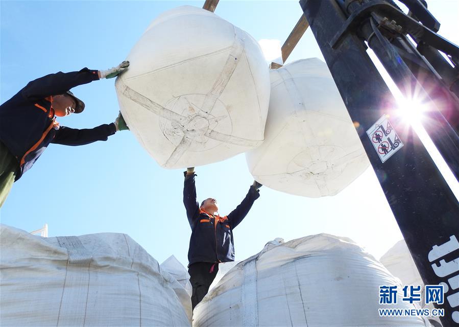 3月12日,江苏省连云港市东海县一家大型化肥企业的工人正在将一批复合肥装车外运。 春回大地,人们纷纷投入到忙碌的生产劳动中。 新华社发(耿玉和 摄)