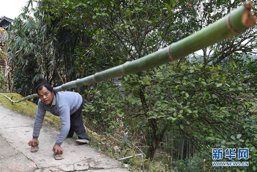 3月14日,在广西三江侗族自治县良口乡产口村长冲屯,李善平驮着一根竹子回家准备喂竹鼠。 李善平家住广西三江侗族自治县良口乡产口村长冲屯,3岁时因患小儿麻痹症导致双腿无法行走,只能依靠双手“走路”,生活困难的他曾是当地的建档立卡贫困户。 2014年初,李善平参加村里的竹鼠养殖培训班,学到了竹鼠养殖技术。当年2月,他向朋友借钱购买40只竹鼠种开始养殖。 2018年,李善平养殖竹鼠的收入达1.1万元,并于当年实现脱贫。现在,他正在修建新房,通过自己勤劳的双手让日子越过越好。 新华社记者 陆波岸 摄