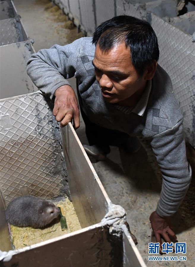 3月14日,在三江侗族自治县良口乡产口村长冲屯,李善平在观察竹鼠的生长情况。 新华社记者 陆波岸 摄