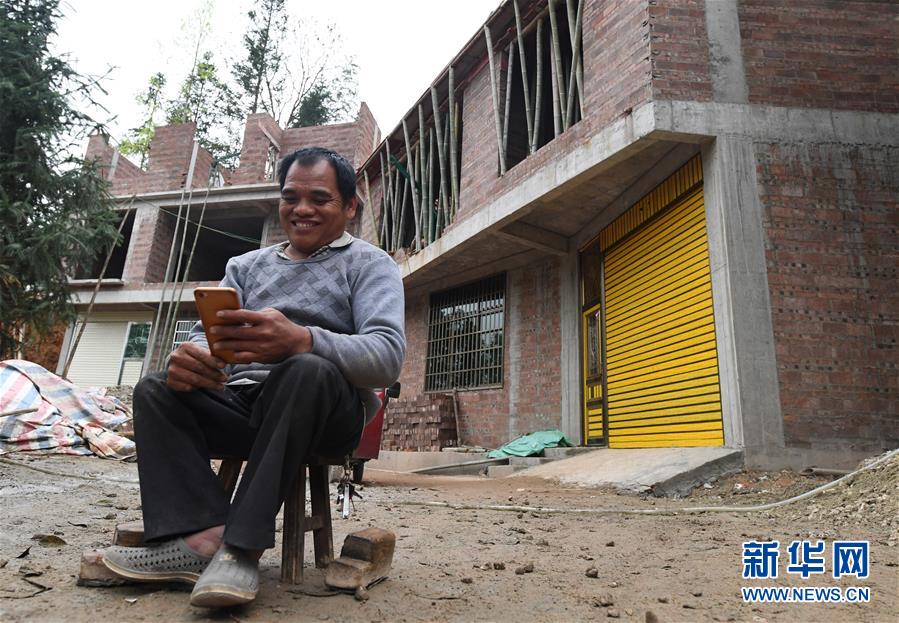 3月14日,在三江侗族自治县良口乡产口村长冲屯,李善平坐在正修建的新房前。 新华社记者 陆波岸 摄