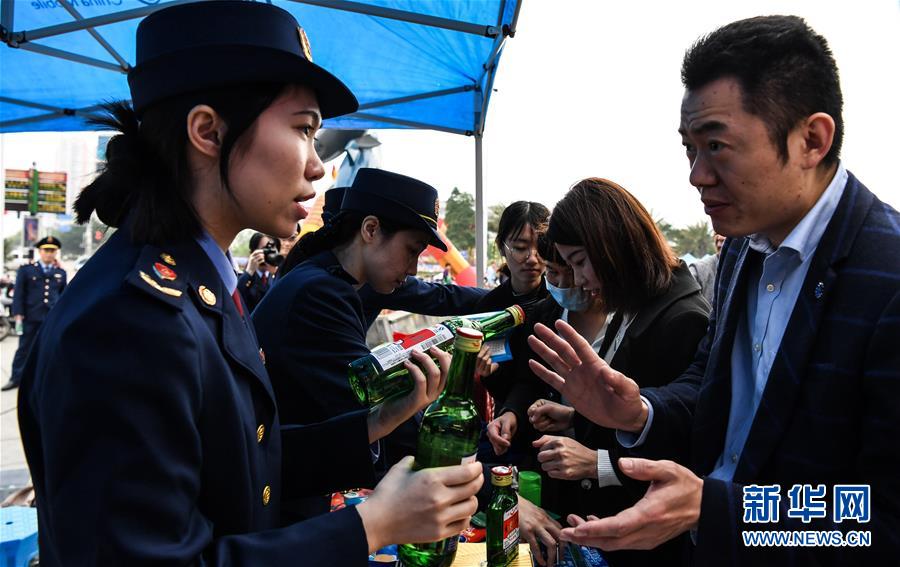3月14日,当地食药监部门工作人员在向市民介绍如何鉴别假酒。 当日,广西钦州市钦南区举办2019年“3·15”国际消费者权益日主题宣传活动,现场为消费者提供介绍假货辨识方法、食品安全检验等多项服务。 新华社记者 张爱林 摄