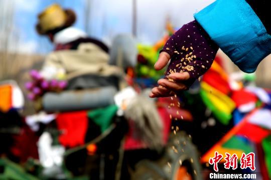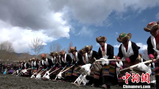 图为克松村春耕仪式上村民边唱边劳作。图为恰玛组春耕开犁仪式上村民播撒良种。 伦珠泽仁 摄