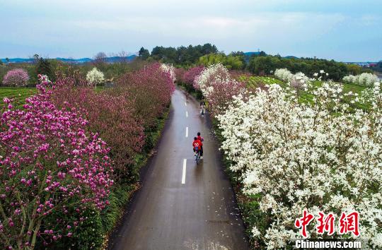 航拍道路两侧的红色、白色的玉兰花树。 鲍赣生 摄