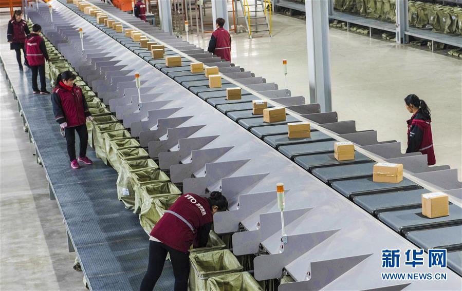3月19日,河北省枣强县肖张镇一家物流公司的工人在快递包裹分拣流水线上作业(无人机拍摄)。近年来,河北省枣强县发挥自身区位优势,科学规划建设物流产业园区,吸引多家物流企业入驻,助推经济快速发展。 新华社记者李晓果摄
