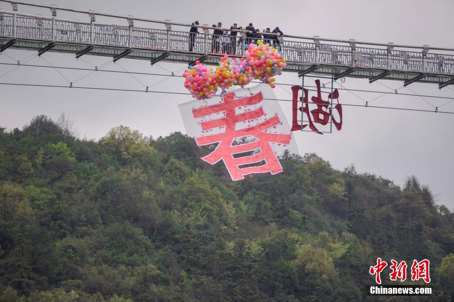 3月21日,直径5米的“春”字缓缓升空。当日,长沙石燕湖风车节开幕,一个用剪纸和风车拼成的巨型“春”字被气球拉升到玻璃桥上,以此迎接春分节气的到来。中新社记者 杨华峰 摄