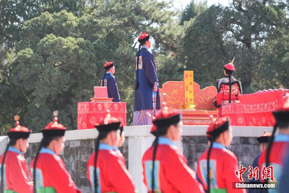 3月21日,祭日典仪现场。当日是二十四节气中的春分,北京日坛公园再现了清代日坛祭日典仪。据史料记载,明清时代的皇帝每年春分时都会率领文武百官在日坛祭祀太阳神。此次再现的祭日典仪根据清乾隆年间文献记载,分为卤簿仪仗、乐舞和祭坛礼仪三部分。。中新社记者 贾天勇 摄