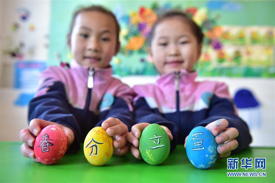 3月21日,河北石家庄新乐市西长寿幼儿园的两名小朋友在展示写着“春分立蛋”的手绘彩蛋。当日是二十四节气中的春分,民间有“春分立蛋”习俗,意在庆祝春天的来临。 新华社发(贾敏杰 摄)