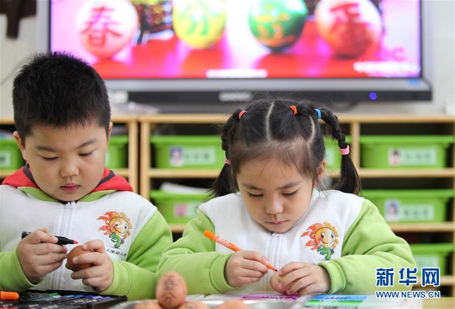 3月21日,扬州大学第三幼儿园的小朋友在绘制彩蛋。当日是二十四节气中的春分,民间有“春分立蛋”习俗,意在庆祝春天的来临。 新华社发(孟德龙 摄)