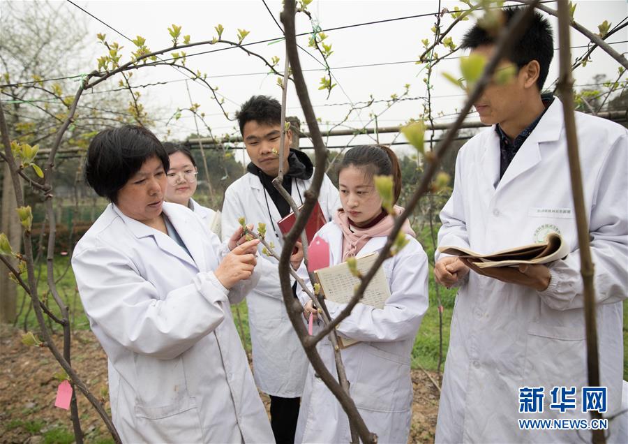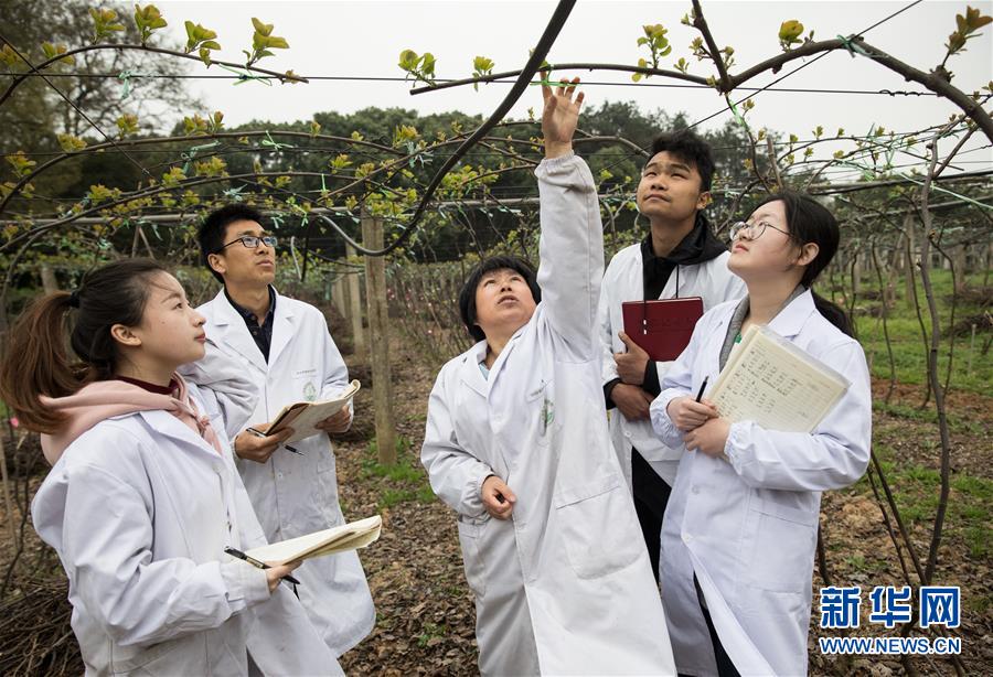 3月21日,在中科院武汉植物园国家猕猴桃种质资源圃,中国科学院武汉植物园猕猴桃资源与育种中心、国家猕猴桃种质资源圃主圃主任钟彩虹研究员(中)和学生们查看猕猴桃生长情况。 中科院武汉植物园国家猕猴桃种质资源圃收集保存有61个种或变种的猕猴桃属植物,包含110余个栽培品种、3万余株种内种间杂交群体,在资源收集数量和保存规模上是目前国内外该属植物遗传多样性涵盖量最大、种质资源最丰富的基因库。 新华社记者 金立旺 摄