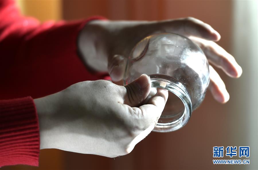 王微在按摩店里给火罐消毒(3月21日摄)。 新华社记者姚剑锋摄