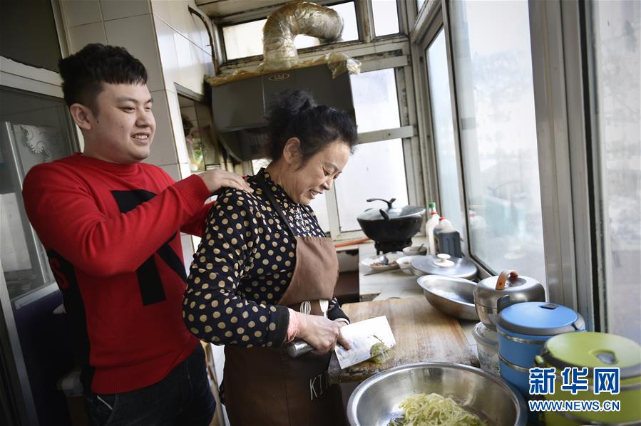 王微的妈妈为按摩店准备晚餐,王微不时给妈妈按摩几下肩背(3月21日摄)。 新华社记者姚剑锋摄