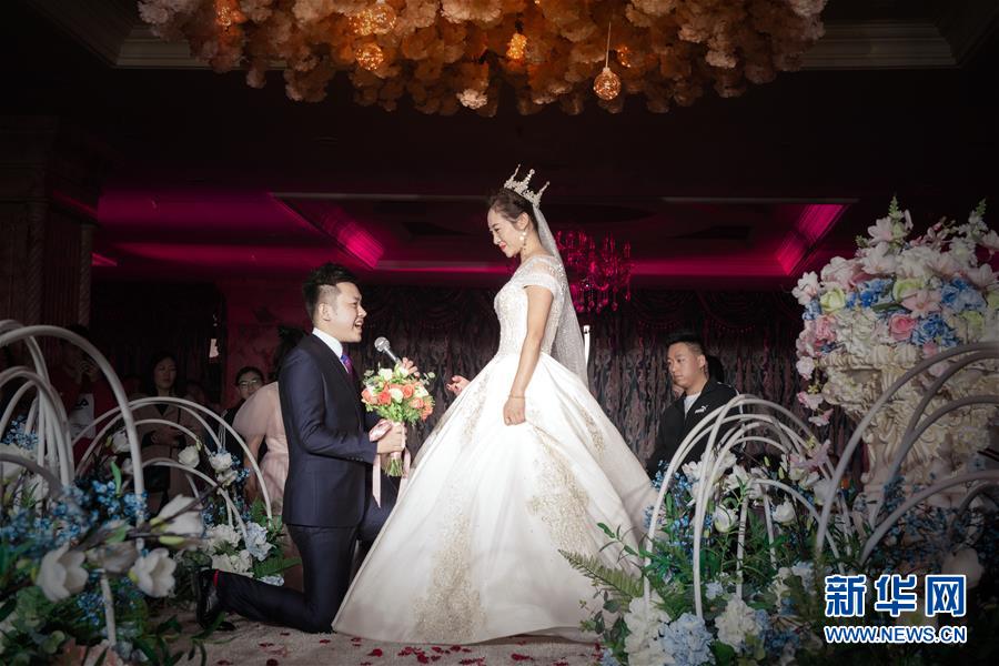 王微在婚礼现场单膝跪地,向妻子刘杰告白(3月16日摄)。 新华社发(王微提供)