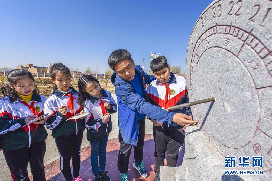 3月22日,在文安县气象局,技术人员为小学生讲解日晷计时办法。 当日,河北文安县科协组织文安县第二小学学生到该县气象局,实地学习气象科普知识,迎接即将到来的世界气象日。 新华社记者李晓果摄