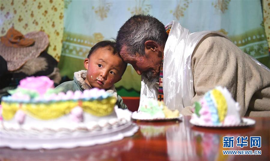 巴珠老人在生日聚会上和自己的曾孙碰额头,以示祝福(3月20日摄)。新华社记者 晋美多吉 摄