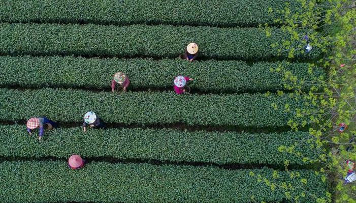 3月25日,茶农在杭州梅家坞村的茶园采摘西湖龙井“明前茶”(无人机拍摄)。3月下旬,浙江杭州西湖龙井茶一级保护区里的梅家坞村、龙井村、翁家山村等产茶区的茶农开始大面积采摘西湖龙井“明前茶”。据当地茶农介绍,由于今年春季雨水偏多,气温起伏较大,今年西湖龙井新茶的采摘期比去年略晚。新华社记者 徐昱 摄