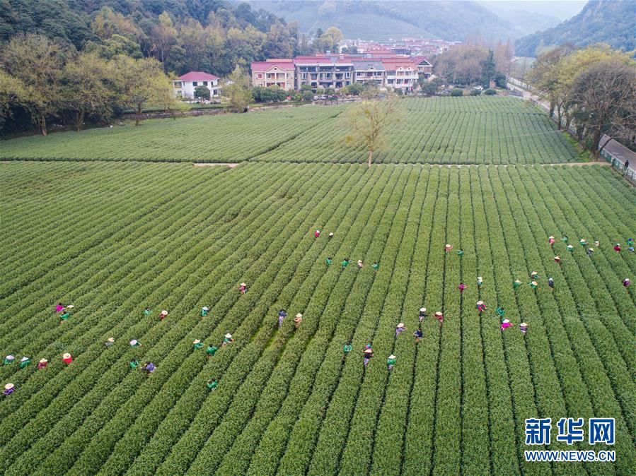 3月25日,茶农在杭州梅家坞村的茶园采摘西湖龙井“明前茶”(无人机拍摄)。3月下旬,浙江杭州西湖龙井茶一级保护区里的梅家坞村、龙井村、翁家山村等产茶区的茶农开始大面积采摘西湖龙井“明前茶”。据当地茶农介绍,由于今年春季雨水偏多,气温起伏较大,今年西湖龙井新茶的采摘期比去年略晚。新华社记者 徐昱 摄