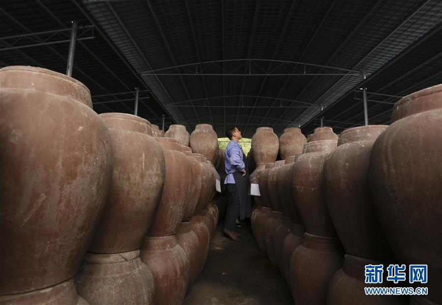 在重庆市涪陵区马武镇某榨菜企业的生产车间内,一名工人在检查腌制涪陵榨菜的坛子(2月21日摄)。新华社记者 兰红光 摄