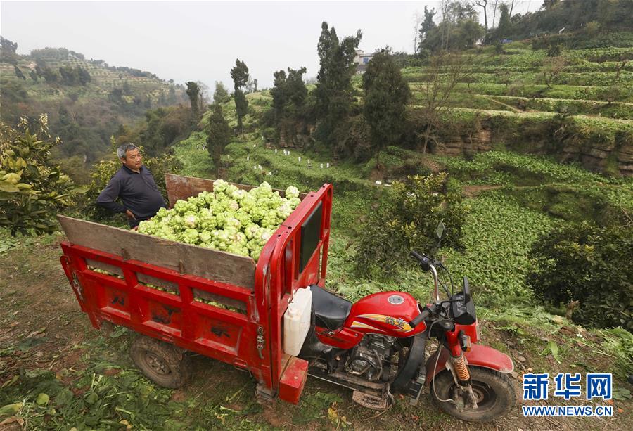 在重庆市涪陵区百胜镇广福村,一辆摩托车的货箱里装满了当地村民采收的青菜头(2月21日摄)。新华社记者 兰红光 摄