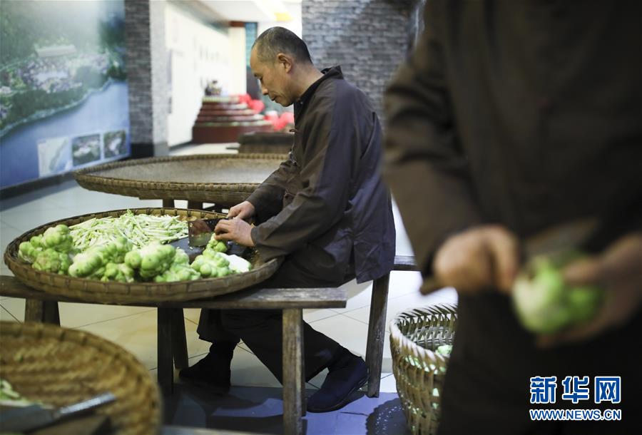 在重庆市涪陵榨菜国家级非物质文化遗产传统工艺制作工作室内,涪陵榨菜国家级非物质文化遗产传承人李文林(左)对挑选出的青菜头进行切丝(2月22日摄)。新华社记者 兰红光 摄
