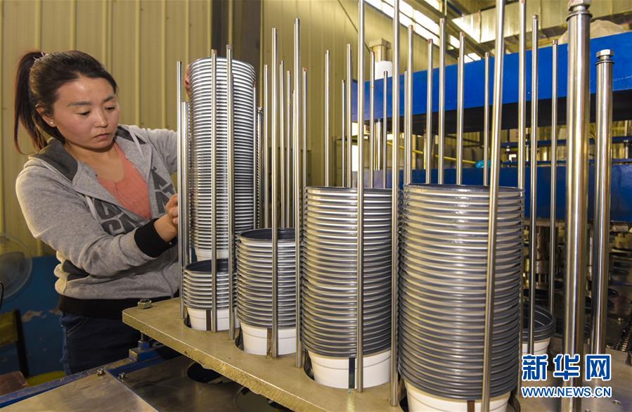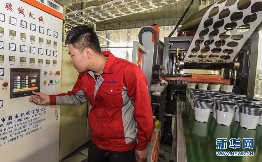 3月27日,在一家从雄安新区外迁到河北省故城县的塑胶包装企业,工人在操作塑胶花盆热压成型机。 近年来,河北省故城县围绕承接雄安新区产业外溢,借势协同发展,鼓励落户到故城的企业向高端、智能、绿色转型升级,着力打造绿色环保新材料产业基地。 新华社记者李晓果摄