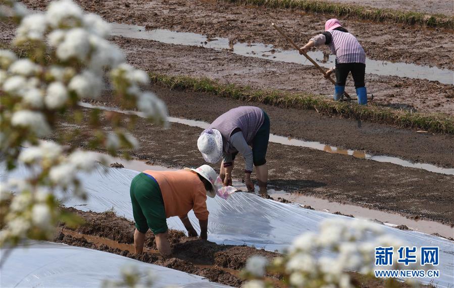 3月27日,云南楚雄市东瓜镇大屯村农民在稻谷秧田里忙碌。 仲春时节,云南省楚雄彝族自治州楚雄市东瓜镇大屯村农民抢抓节令,播种稻谷秧苗。 新华社记者杨宗友摄
