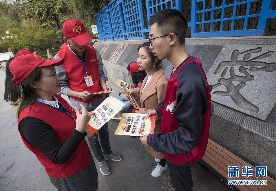 3月27日,全国道德模范谭之平(左一)和志愿者们一起为路人宣讲孝文化。当日,全国道德模范谭之平与湖北职业技术学院的学生志愿者来到孝感董永公园,在现场举行宣讲孝文化、撰写感恩贺卡等系列书信感恩活动。近年来,湖北孝感将孝文化与核心价值观有机融合,积极探索出一条传承弘扬孝文化,培育和践行社会主义核心价值观的有效途径。新华社记者 肖艺九 摄